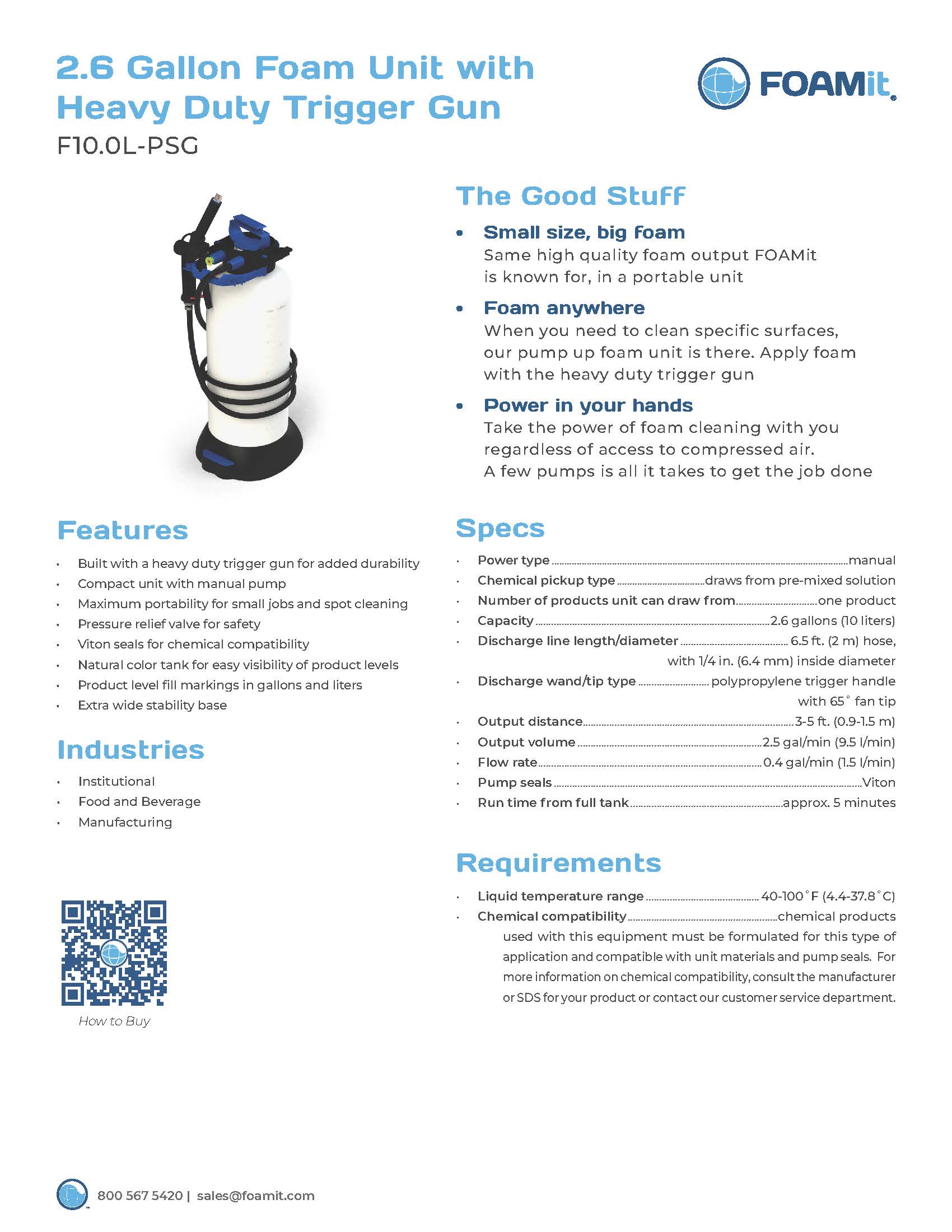 • 0.4 gallon Foam-It F1.5L manual pre mix foam sprayer with thumb trigger