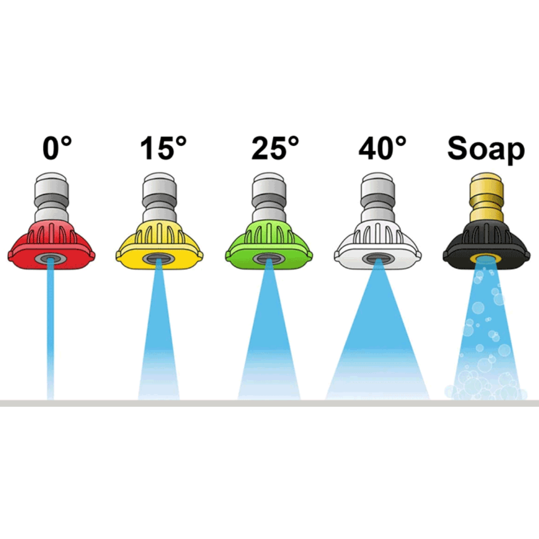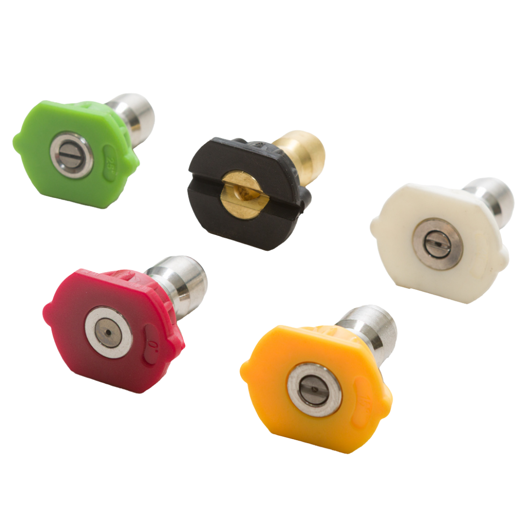 Color-coded quick connect spray tips available in 0°, 15°, 25°, and 40° patterns. Designed for fast change-out and reliable performance in commercial and residential pressure washing applications.