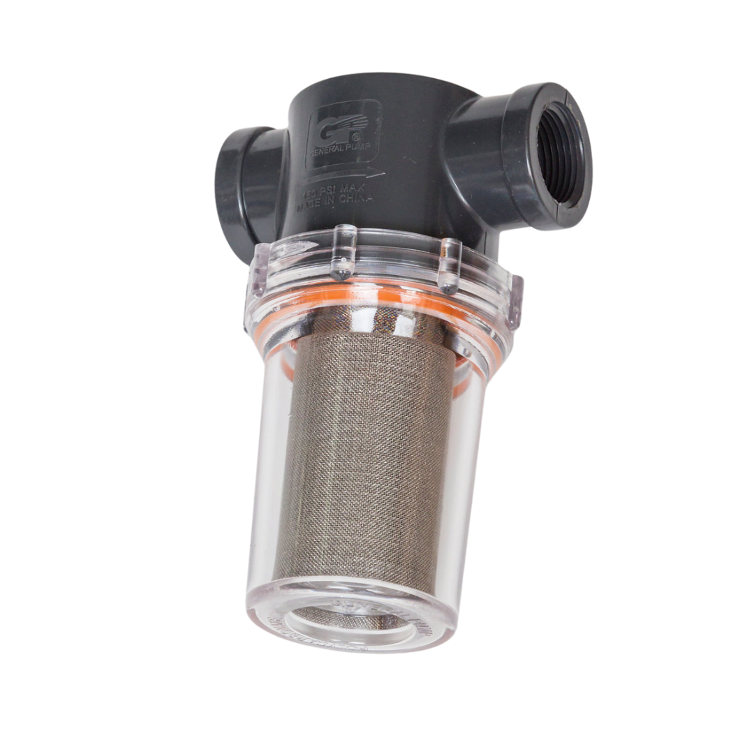 This inline water filter is designed to protect pumps and pressure washer systems by filtering debris from the incoming water supply. Available in multiple inlet sizes, with replacement bowls and screens sold separately.